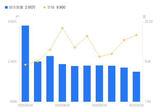 近一年(2024年11月20日至2025年10月20日),麦趣尔A股股东户数从2.46万户,减低至2万户,降幅18.76%,区间股价上涨23.27%。