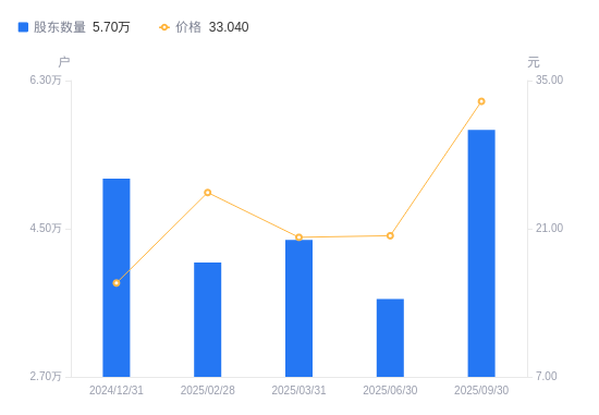 近一年(2024年9月30日至2025年9月30日),东睦股份A股股东户数从4.34万户,增加至5.7万户,增幅31.26%,区间股价上涨124.76%。
