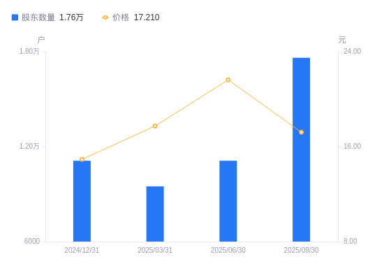 近一年(2024年9月30日至2025年9月30日),力诺药包A股股东户数从1.26万户,增加至1.76万户,增幅40.01%,区间股价上涨28.50%。