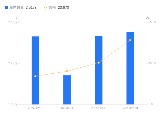 近一年(2024年9月30日至2025年9月30日),中泰股份A股股东户数从2.5万户,增加至2.51万户,增幅0.41%,区间股价上涨97.04%。