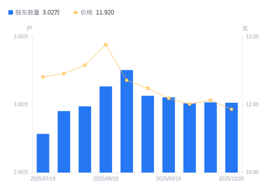 近一年(2024年10月31日至2025年10月20日),劲仔食品A股股东户数从1.77万户,增加至3.02万户,增幅70.08%,区间股价下跌0.79%。