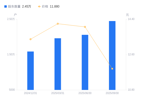 近一年(2024年9月30日至2025年9月30日),佳禾食品A股股东户数从1.09万户,增加至2.45万户,增幅125.17%,区间股价上涨1.88%。