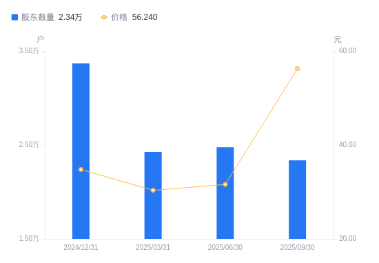 近一年(2024年9月30日至2025年9月30日),胜蓝股份A股股东户数从2.17万户,增加至2.34万户,增幅7.66%,区间股价上涨124.51%。