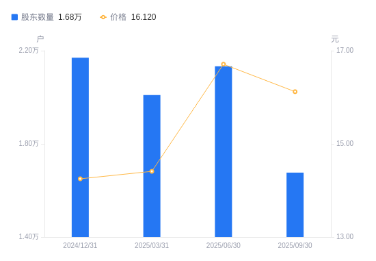 近一年(2024年9月30日至2025年9月30日),中农联合A股股东户数从2.01万户,减低至1.68万户,降幅16.69%,区间股价上涨27.33%。