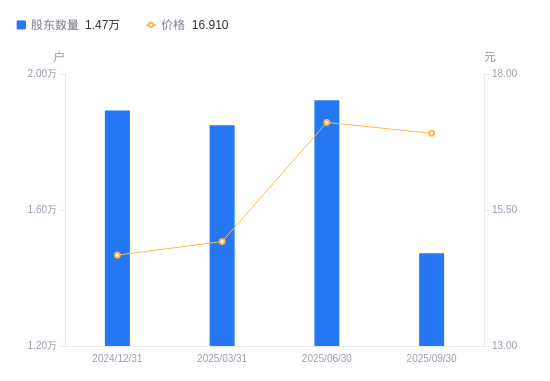 近一年(2024年9月30日至2025年9月30日),龙韵股份A股股东户数从1.87万户,减低至1.47万户,降幅21.38%,区间股价上涨24.43%。