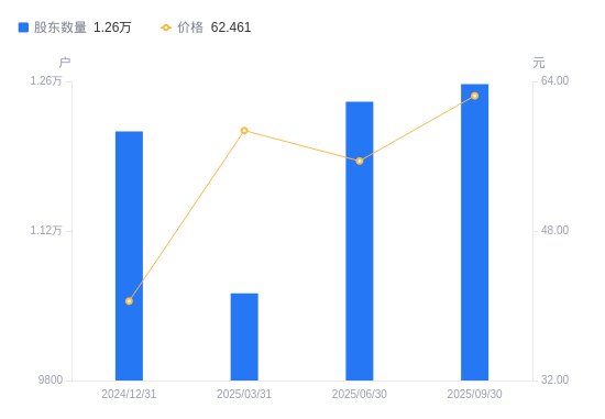 近一年(2024年9月30日至2025年9月30日),信捷电气A股股东户数从1.29万户,减低至1.26万户,降幅2.28%,区间股价上涨99.10%。