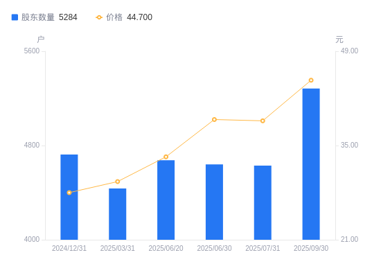 10月28日消息,数据显示,截至2025年9月30日,誉辰智能A股股东总户数为5284户,较上期(2025年7月31日)增加655户,增幅14.15%。公司最新A股总股本为5600万股,其中流通A股2646.1万股,户均持有流通A股数量为5007.76股,较上期减少708.59股,降幅12.40%;户均持流通A股市值22.38万元,较上期增加2795.45元,增幅1.26%。