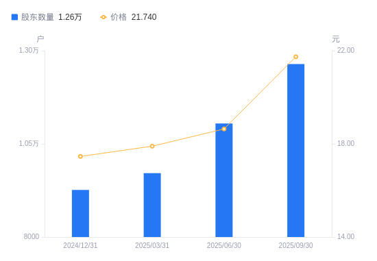 近一年(2024年9月30日至2025年9月30日),中晟高科A股股东户数从9290户,增加至1.26万户,增幅36.08%,区间股价上涨104.52%。