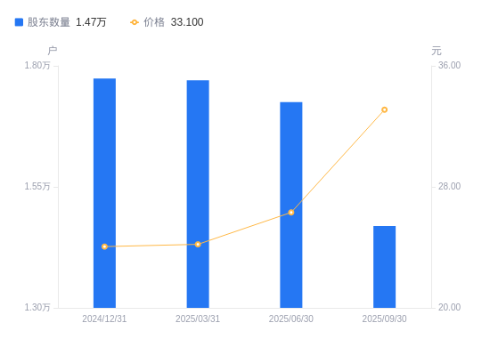 10月28日消息,数据显示,截至2025年9月30日,奥尼电子A股股东总户数为1.47万户,较上期(2025年6月30日)减少2560户,降幅14.84%。公司最新A股总股本为1.16亿股,其中流通A股1.12亿股,户均持有流通A股数量为7606.72股,较上期增加1128.75股,增幅17.42%;户均持流通A股市值25.18万元,较上期增加8.13万元,增幅47.73%。