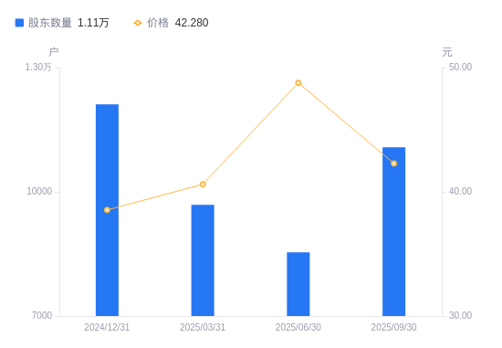 10月28日消息,数据显示,截至2025年9月30日,立高食品A股股东总户数为1.11万户,较上期(2025年6月30日)增加2536户,增幅29.70%。公司最新A股总股本为1.69亿股,其中流通A股1.17亿股,户均持有流通A股数量为1.05万股,较上期减少3125.45股,降幅22.90%;户均持流通A股市值44.49万元,较上期减少22.07万元,降幅33.16%。
