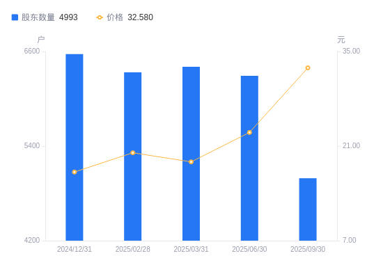 近一年(2024年9月30日至2025年9月30日),泰祥股份A股股东户数从7541户,减低至4993户,降幅33.79%,区间股价上涨105.42%。