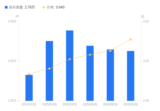 近一年(2024年9月30日至2025年9月30日),柳化股份A股股东户数从2.07万户,增加至2.76万户,增幅33.42%,区间股价上涨43.31%。