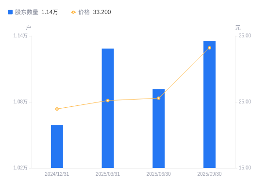 近一年(2024年9月30日至2025年9月30日),新化股份A股股东户数从1.06万户,增加至1.14万户,增幅6.88%,区间股价上涨55.53%。