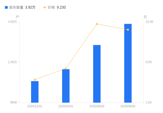 近一年(2024年9月30日至2025年9月30日),先达股份A股股东户数从1.76万户,增加至3.92万户,增幅122.31%,区间股价上涨126.78%。