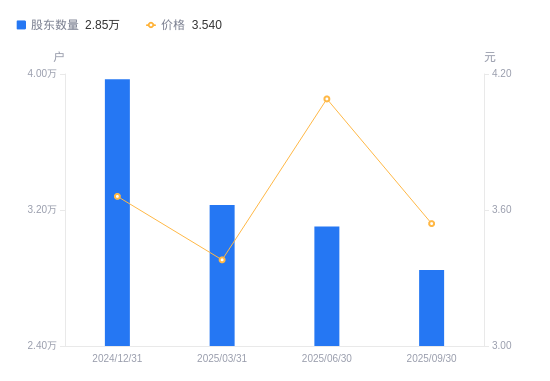 近一年(2024年9月30日至2025年9月30日),ST银江A股股东户数从4.32万户,减低至2.85万户,降幅34.15%,区间股价上涨76.12%。
