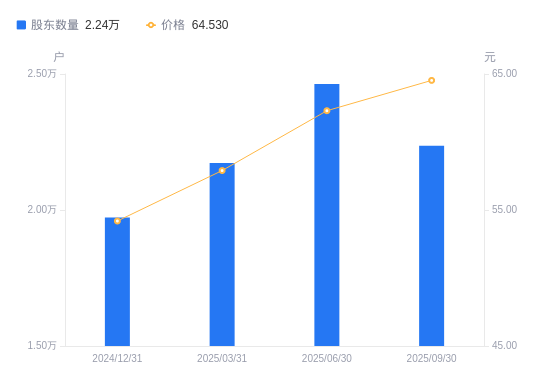 10月28日消息,数据显示,截至2025年9月30日,曼恩斯特A股股东总户数为2.24万户,较上期(2025年6月30日)减少2271户,降幅9.22%。公司最新A股总股本为1.44亿股,其中流通A股5789.47万股,户均持有流通A股数量为2588.98股,较上期增加238.69股,增幅10.16%;户均持流通A股市值16.71万元,较上期增加2.06万元,增幅14.10%。