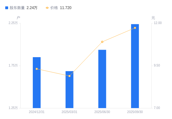 近一年(2024年9月30日至2025年9月30日),金鹰重工A股股东户数从1.94万户,增加至2.24万户,增幅15.38%,区间股价上涨34.74%。
