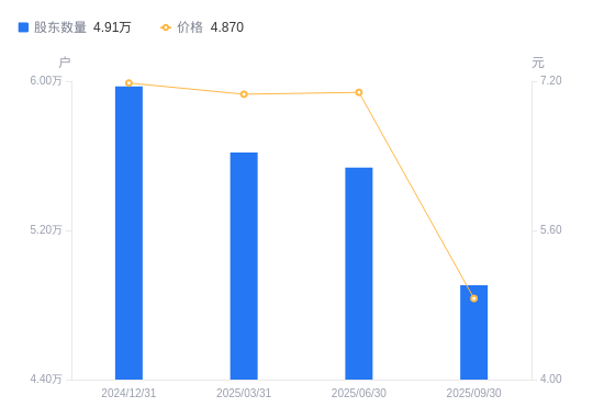 近一年(2024年9月30日至2025年9月30日),恒信东方A股股东户数从5.27万户,减低至4.91万户,降幅6.99%,区间股价下跌13.81%。