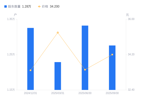 10月28日消息,数据显示,截至2025年9月30日,宇邦新材A股股东总户数为1.28万户,较上期(2025年6月30日)减少562户,降幅4.22%。公司最新A股总股本为1.1亿股,其中流通A股1.04亿股,户均持有流通A股数量为8171.21股,较上期增加344.79股,增幅4.41%;户均持流通A股市值27.95万元,较上期增加1.78万元,增幅6.81%。