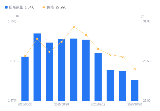近一年(2024年11月8日至2025年10月20日),三元生物A股股东户数从1.38万户,增加至1.54万户,增幅12.14%,区间股价下跌0.21%。
