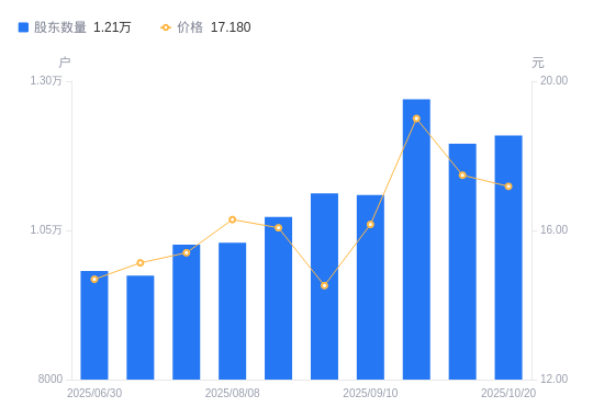 近一年(2024年12月31日至2025年10月20日),凯龙高科A股股东户数从1.11万户,增加至1.21万户,增幅8.75%,区间股价上涨45.47%。