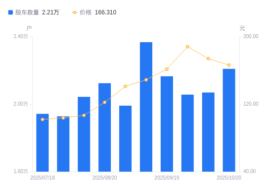 近一年(2024年12月31日至2025年10月20日),震裕科技A股股东户数从8740户,增加至2.21万户,增幅152.78%,区间股价上涨220.99%。