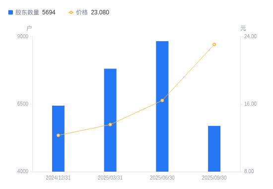 近一年(2024年9月30日至2025年9月30日),汇隆新材A股股东户数从6918户,减低至5694户,降幅17.69%,区间股价上涨85.34%。