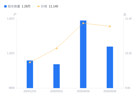 近一年(2024年9月30日至2025年9月30日),上海雅仕A股股东户数从1.12万户,增加至1.28万户,增幅14.67%,区间股价上涨22.84%。