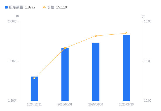 近一年(2024年9月30日至2025年9月30日),恒锋信息A股股东户数从1.66万户,增加至1.87万户,增幅12.31%,区间股价上涨32.08%。