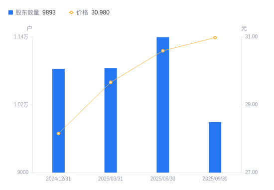 近一年(2024年9月30日至2025年9月30日),优宁维A股股东户数从1.2万户,减低至9893户,降幅17.60%,区间股价上涨10.32%。
