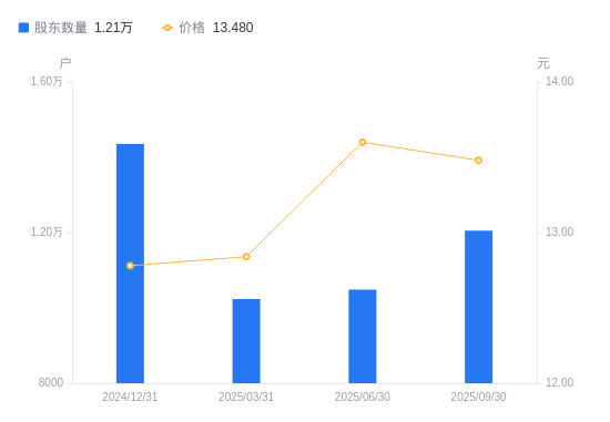 10月29日消息,数据显示,截至2025年9月30日,华菱精工A股股东总户数为1.21万户,较上期(2025年6月30日)增加1568户,增幅14.96%。公司最新A股总股本为1.33亿股,其中流通A股1.33亿股,户均持有流通A股数量为1.11万股,较上期减少1655股,降幅13.01%;户均持流通A股市值14.92万元,较上期减少2.38万元,降幅13.78%。