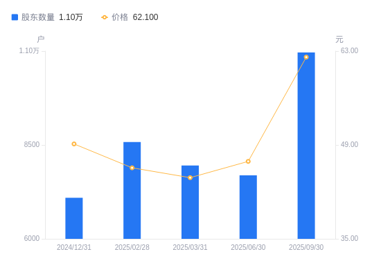 近一年(2024年9月30日至2025年9月30日),联瑞新材A股股东户数从6569户,增加至1.1万户,增幅66.86%,区间股价上涨83.19%。