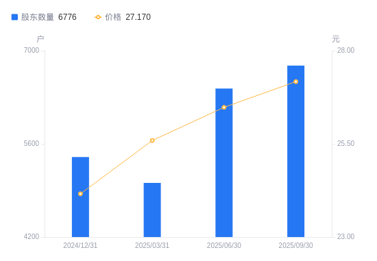近一年(2024年9月30日至2025年9月30日),威尔药业A股股东户数从5843户,增加至6776户,增幅15.97%,区间股价上涨28.77%。