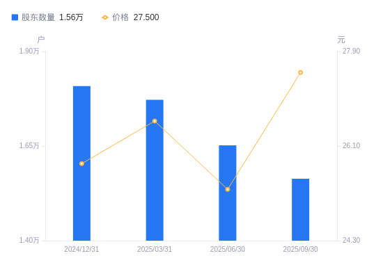 近一年(2024年9月30日至2025年9月30日),盛剑科技A股股东户数从1.76万户,减低至1.56万户,降幅10.97%,区间股价上涨17.94%。