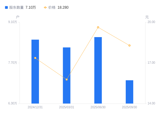 近一年(2024年9月30日至2025年9月30日),科蓝软件A股股东户数从7.13万户,减低至7.1万户,降幅0.47%,区间股价上涨26.94%。