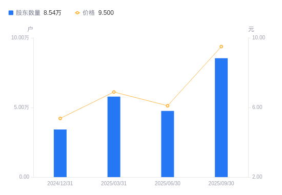 近一年(2024年9月30日至2025年9月30日),杭电股份A股股东户数从3.84万户,增加至8.54万户,增幅122.63%,区间股价上涨106.52%。