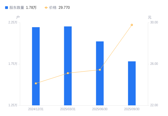 近一年(2024年9月30日至2025年9月30日),星德胜A股股东户数从2.53万户,减低至1.78万户,降幅29.64%,区间股价上涨42.37%。