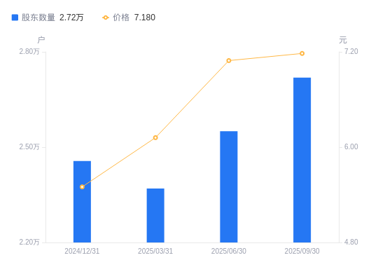 近一年(2024年9月30日至2025年9月30日),湖南海利A股股东户数从2.65万户,增加至2.72万户,增幅2.46%,区间股价上涨40.51%。