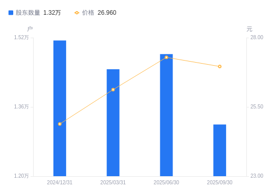 10月30日消息,数据显示,截至2025年9月30日,天新药业A股股东总户数为1.32万户,较上期(2025年6月30日)减少1625户,降幅10.96%。公司最新A股总股本为4.38亿股,其中流通A股1.47亿股,户均持有流通A股数量为1.11万股,较上期增加1222.1股,增幅12.32%;户均持流通A股市值30.05万元,较上期增加2.97万元,增幅10.96%。