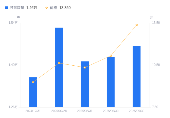 近一年(2024年9月30日至2025年9月30日),鑫源智造A股股东户数从1.16万户,增加至1.46万户,增幅26.43%,区间股价上涨72.01%。