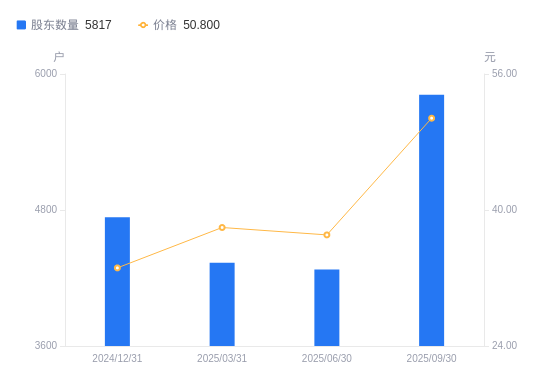 10月30日消息,数据显示,截至2025年9月30日,美埃科技A股股东总户数为5817户,较上期(2025年6月30日)增加1542户,增幅36.07%。公司最新A股总股本为1.34亿股,其中流通A股5098.56万股,户均持有流通A股数量为8764.93股,较上期减少3161.53股,降幅26.51%;户均持流通A股市值44.53万元,较上期增加3144.73元,增幅0.71%。