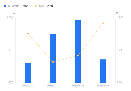 10月30日消息,数据显示,截至2025年9月30日,松炀资源A股股东总户数为1.69万户,较上期(2025年6月30日)减少4823户,降幅22.23%。公司最新A股总股本为2.05亿股,其中流通A股2.05亿股,户均持有流通A股数量为1.21万股,较上期增加2697.08股,增幅28.59%;户均持流通A股市值27.42万元,较上期增加13.6万元,增幅98.37%。