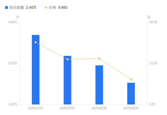 近一年(2024年9月30日至2025年9月30日),ST华扬A股股东户数从3.71万户,减低至2.44万户,降幅34.12%,区间股价下跌0.82%。