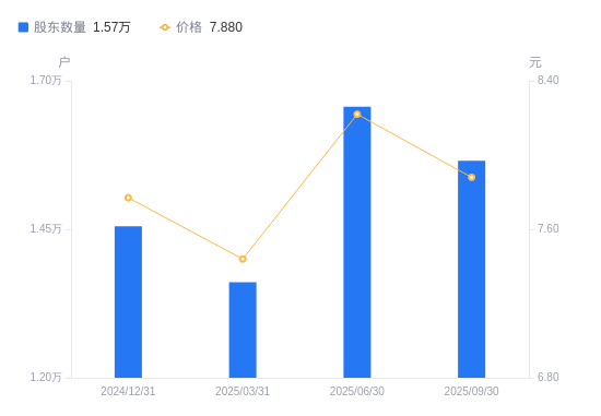 10月30日消息,数据显示,截至2025年9月30日,展鹏科技A股股东总户数为1.57万户,较上期(2025年6月30日)减少913户,降幅5.51%。公司最新A股总股本为2.92亿股,其中流通A股2.92亿股,户均持有流通A股数量为1.87万股,较上期增加1028.2股,增幅5.83%;户均持流通A股市值14.7万元,较上期增加2109.06元,增幅1.46%。