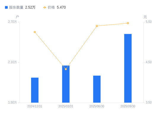 近一年(2024年9月30日至2025年9月30日),灵康药业A股股东户数从1.66万户,增加至2.52万户,增幅51.98%,区间股价上涨21.29%。