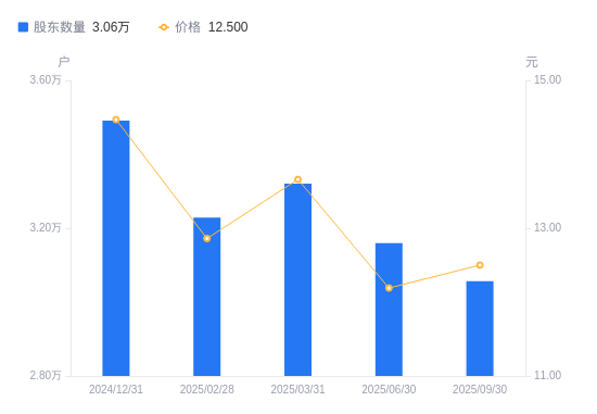10月30日消息,数据显示,截至2025年9月30日,百通能源A股股东总户数为3.06万户,较上期(2025年6月30日)减少1024户,降幅3.24%。公司最新A股总股本为4.61亿股,其中流通A股2.14亿股,户均持有流通A股数量为6992.47股,较上期增加226.64股,增幅3.35%;户均持流通A股市值8.74万元,较上期增加4930.43元,增幅5.98%。