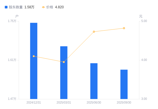 近一年(2024年9月30日至2025年9月30日),京能置业A股股东户数从2.19万户,减低至1.58万户,降幅27.91%,区间股价上涨19.60%。