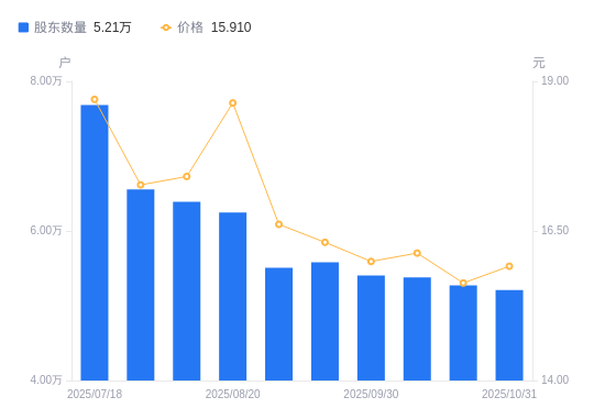 11月3日消息,数据显示,截至2025年10月31日,电光科技A股股东总户数为5.21万户,较上期(2025年10月20日)减少645户,降幅1.22%。公司最新A股总股本为3.62亿股,其中流通A股3.46亿股,户均持有流通A股数量为6644.2股,较上期增加81.28股,增幅1.24%;户均持流通A股市值10.57万元,较上期增加3130.79元,增幅3.05%。