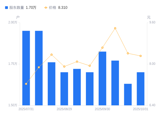 近一年(2024年12月10日至2025年10月31日),优彩资源A股股东户数从1.89万户,减低至1.7万户,降幅10.05%,区间股价上涨33.11%。