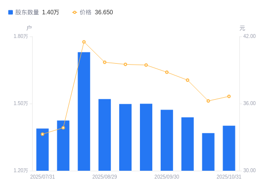 近一年(2024年10月31日至2025年10月31日),博硕科技A股股东户数从1.53万户,减低至1.4万户,降幅8.52%,区间股价上涨20.33%。